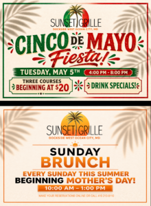 Sunset Grille is located waterfront in West Ocean City, Maryland at the Sunset Marina. Enjoy beautiful views on the bay as you dine on fresh seafood, steaks, and much more! With 4 bars and 6 dining areas, there is something for everyone!